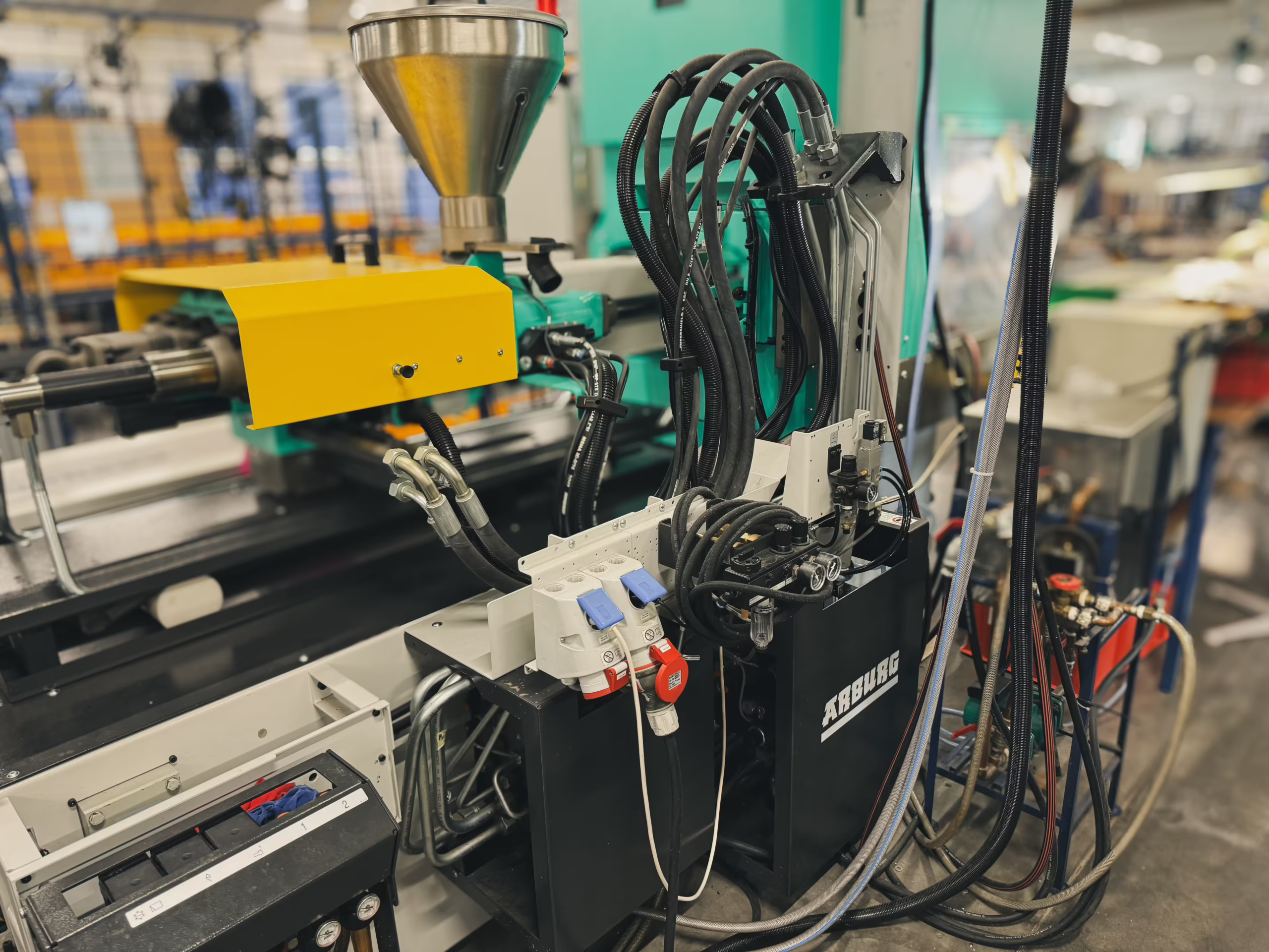 Produkcja osłon, gniazd i elementów konstrukcyjnych do wiązek kablowych na wtryskarkach Arburg.